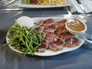 Un super Thon au lait de coco et sauce vanille sur le port à la passe de Tiputa (au Snack Chez Lili, on recommande fortement, une Malgache ayant adapté sa cuisine traditionnelle avec celle de Polynésie, une pépite)