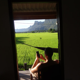 Enfin route vers Khong Lor cave. On arrive trop tard pour la visiter. Mais on se pose dans un hôtel magnifique : Khong Lor Ecolodge 2. Bungalow avec vue sur les rizières, on se régale. On mange de nouveau tous à « the best one restaurant Konglor Cave », très bon mais qui nous offre un nouveau spectacle de difficulté et de lenteur. On finit par prendre les plats qu’il emmène même si ce ne sont pas ceux qu’on a commandés, au bout de 2h d’attente, on mangerait n’importe quoi.