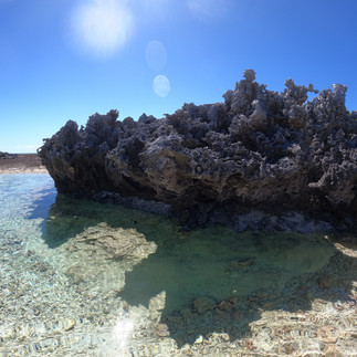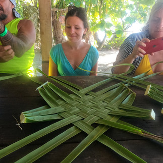 La deuxième journée est consacrée à l’île aux récifs. Endroit emblématique de Rangiroa il faut nécessairement passer par un guide pour s’y rendre. Nous y sommes allés avec Léon (Pa’ati excursion). C’était une journée merveilleuse. Léon nous récupère au gite et nous allons jusqu’à Tiputa où nous embarquons sur son bateau. On commence par essayer de voir les dauphins, on croise leur chemin dans l’océan, à la surface. Puis cap sur l’île aux récifs à une heure de bateau. On arrive devant un paysage de carte postale. Les palmiers ont poussé sur les motu disposés ça et là. Le bleu est encore plus beau que dans n’importe quelle publicité de séjour de luxe. Le bateau reste là, nous continuons les pieds dans l’eau jusqu’aux concrétions de pierres, résultat de la rencontre entre deux plaques tectoniques ; Les formes données sont impressionnantes et très abrasives. Les vagues se fracassent sur ces roches et le soleil écrase toute forme de vie. Les petites piscines naturelles permettent de se rafraichir. On traverse ensuite un bras de l’océan jusqu’au motu privé de Léon où ils ont commencé à faire à manger. La table est dressée avec des feuilles de palmier et une nurserie de requins se trouve au pied du motu dans les eaux peu profondes de l’océan. La vue est imprenable ! le repas est excellent. On n’a jamais mangé un pain coco aussi bon ! et du poisson cru à la tahitienne et du mahi mahi cuit au barbecue. Extraordinaire. Léon a ensuite préparé des feuilles de palmiers pour nous apprendre à faire un petit sac. Le tressage s’annonce un peu compliqué mais on s’amuse bien.