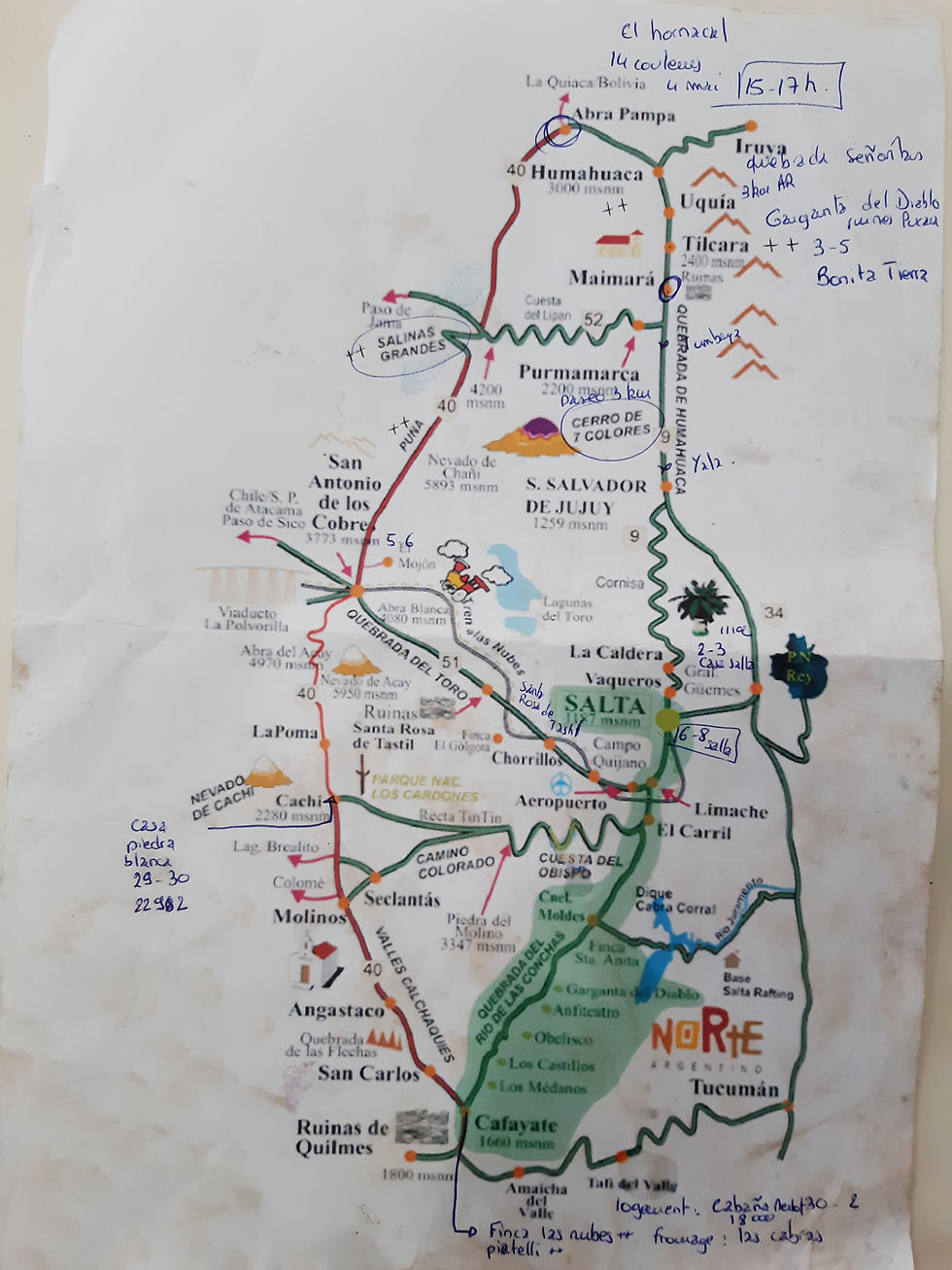 La partie route n’est pas la plus intéressante, on passe par San Salvador de Jujuy et on continue notre chemin. Une fois les montagnes dépassées, le ciel bleu perce et les quebradas et autres formations rocheuses font leur apparition.