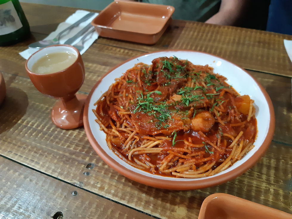 On se dirige à présent vers une galerie d’art traditionnelle à côté du parc Bolivar où on goute le Mondongo et l’aji de fideo. Le premier plat est une purée de maïs avec de la viande de porc en sauce (couenne de porc, pomme de terre et piment rouge doux). Le second est un plat de pâtes épicé. Le tout agrémenté de chicha traditionnelle (très sucrée).